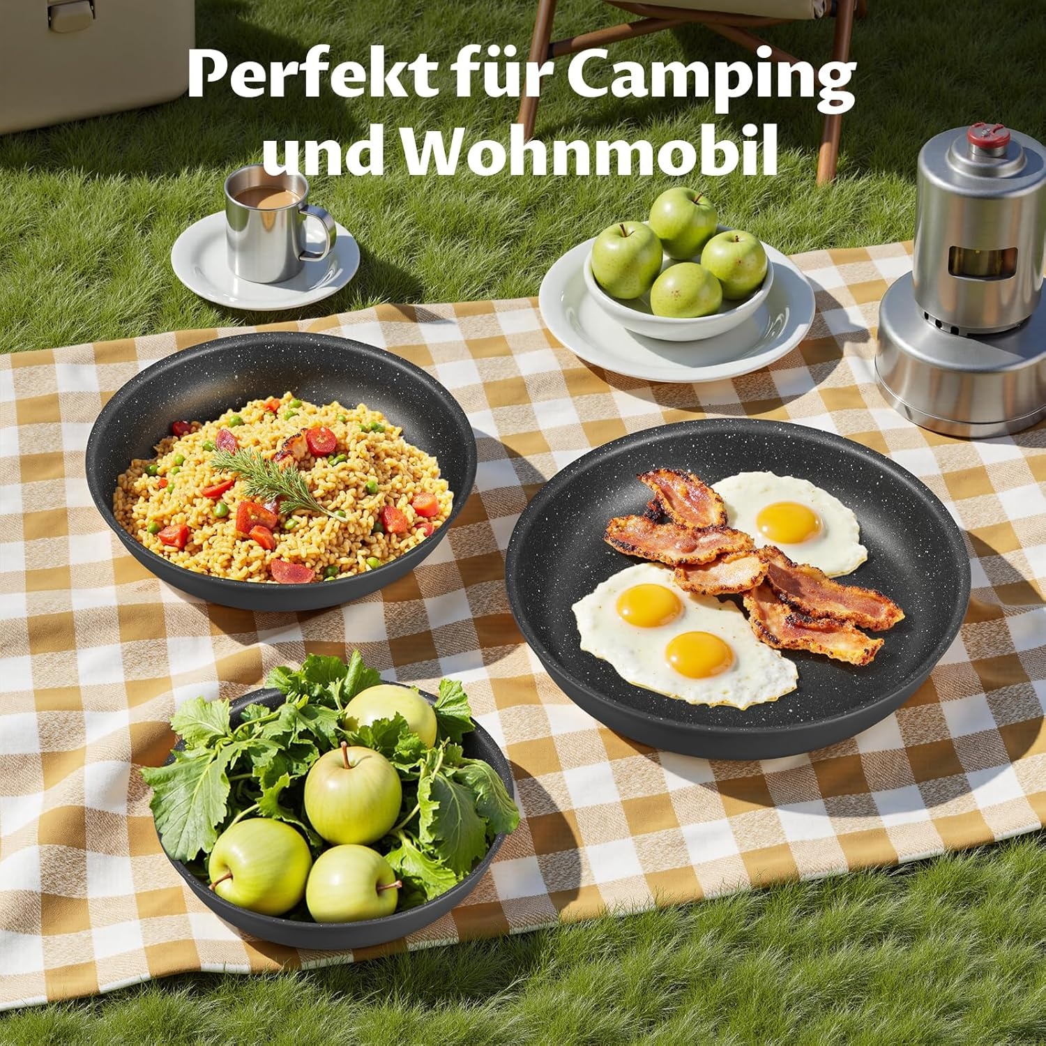 - Set-Zusammensetzung:3 Bratpfannen (20 cm, 24 cm, 28 cm Durchmesser), 1 abnehmbarer Griff