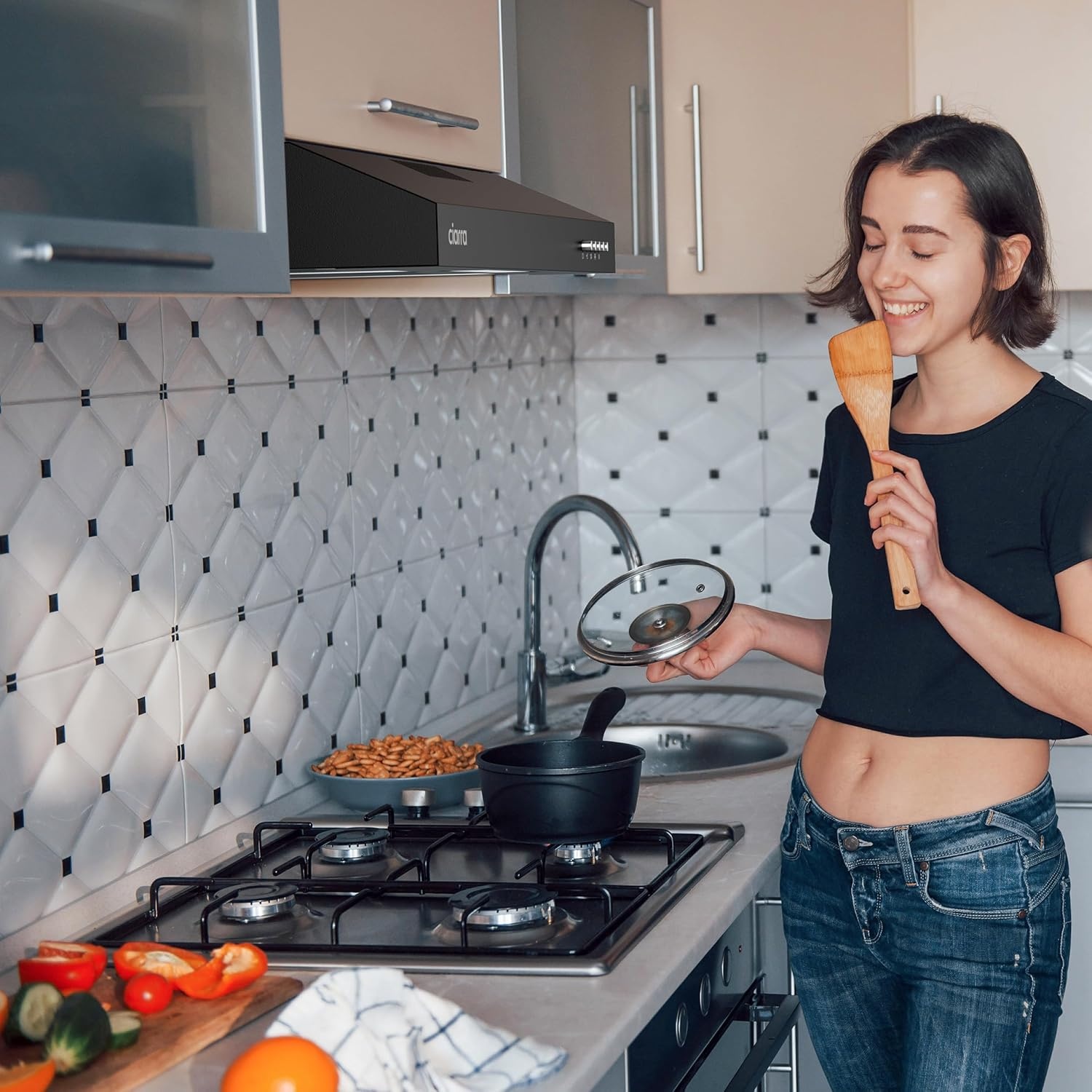 - Die Dunstabzugshaube bietet vielseitige Installationsmöglichkeiten für Wand- oder Unterbaumontage.