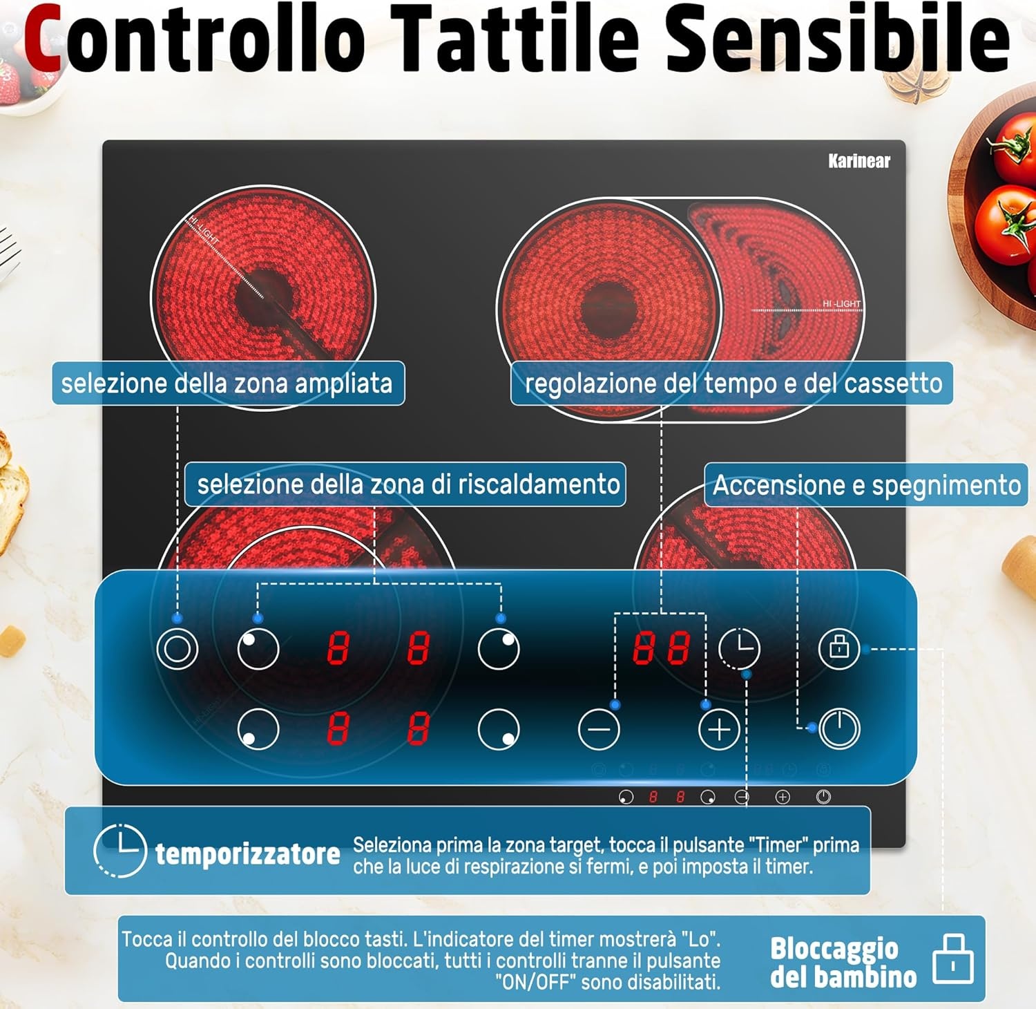 - Umfassende Sicherheitsfunktionen: Abschaltautomatik, Überhitzungsschutz, Kindersicherung, Restwärmeanzeige.